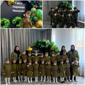 Воспитатели Жанета Авалуевна и Хадижат Султановна и музыкальный руководитель Петимат Вахаевна вместе с воспитанниками средней группы «Улыбка» подготовили и провели конкурс «А ну-ка, мальчики!» и утренник «День Защитников Отечества». В состязаниях дети показали творческие и физические качества. Болельщики каждой команды эмоционально-заинтересовано следили за ходом конкурса, поддерживая свою команду.                                    А также рассказывали стихи, пели песни. Все участники утренника были одеты в военные формы, что особенно украшало праздник.                                                                Следует отметить и позитивную атмосферу, созданную оформлением зала и пособия, для проведения мероприятий, посвященные Дню защитника Отечества.