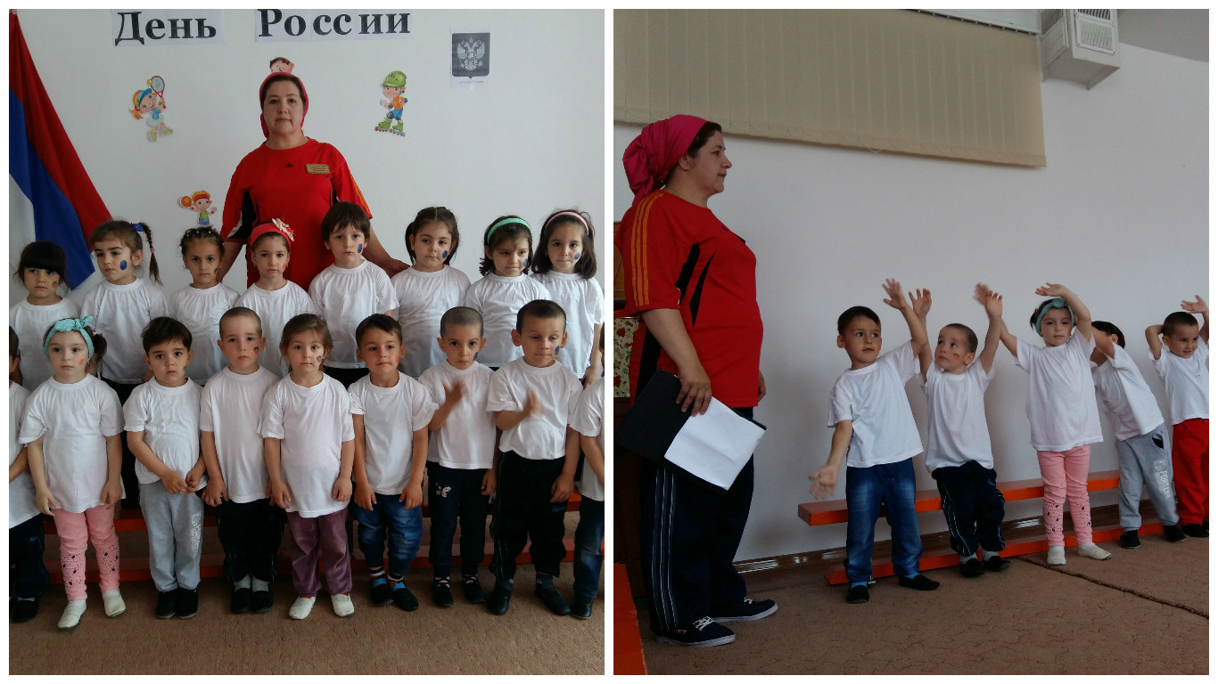 10.06.2016В МБДОУ «Детский сад № 10 г. Гудермес» инструктором по физической культуре Х.Х. Дудуркаевой проведен физкультурный игровой досуг между вторыми младшими группами посвященный Дню России. Досуг прошел оформленном зале к этой дате. Дудуркаева Х.Х. прививала стойкий интерес к физкультуре и спорту, к личным достижениям и достижениям команды. Упражняла детей в выполнении основных движений, развивала ловкость, быстроту, повышала двигательную активность. Все дети активно участвовали в играх.